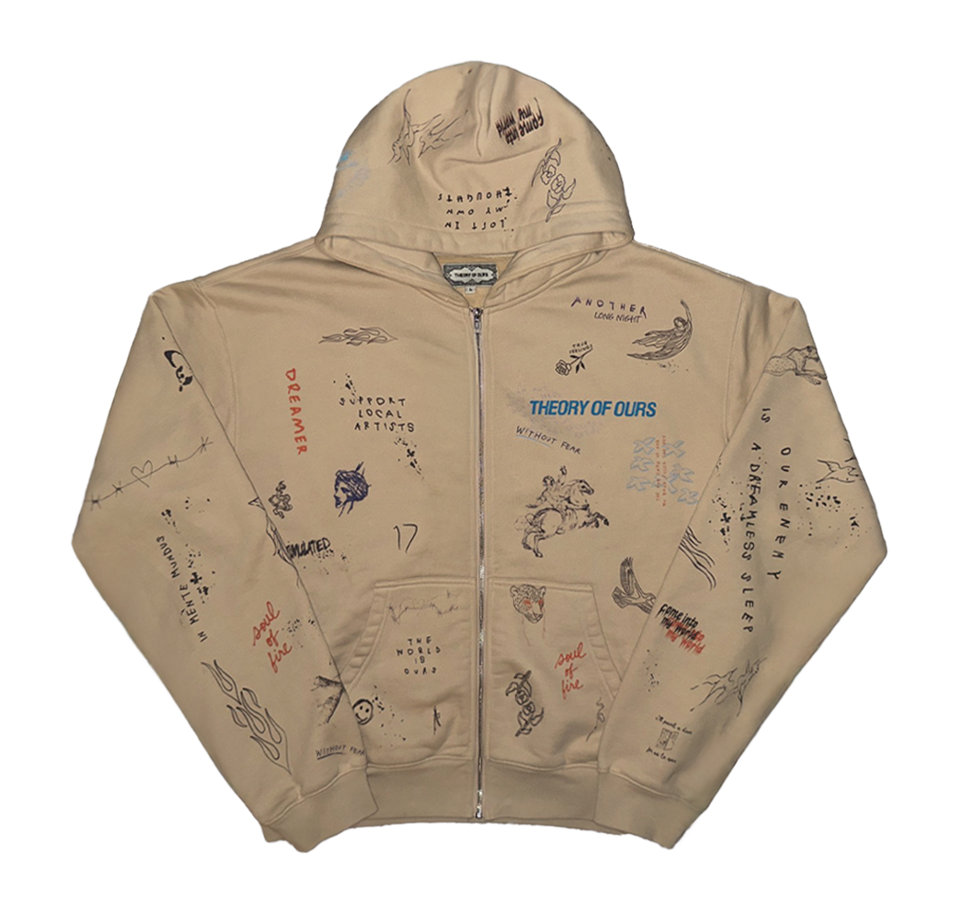 A hand-drawn collage of late-night thoughts, turned into a wearable piece of art.